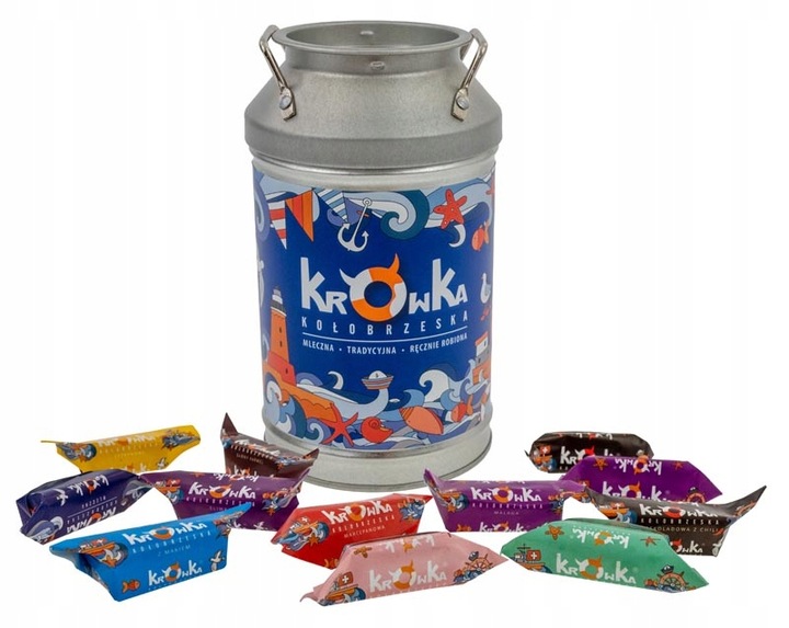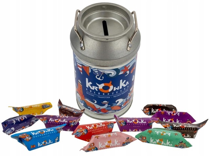 Mix krówek w kance 225 g Krówka Kołobrzeska to zestaw ręcznie robionych słodyczy zapakowanych w oryginalne, metalowe opakowanie w formie kanki–skarbonki. To połączenie tradycyjnego smaku krówek z nietuzinkową formą, która sprawia, że produkt doskonale sprawdza się jako prezent lub pamiątka.